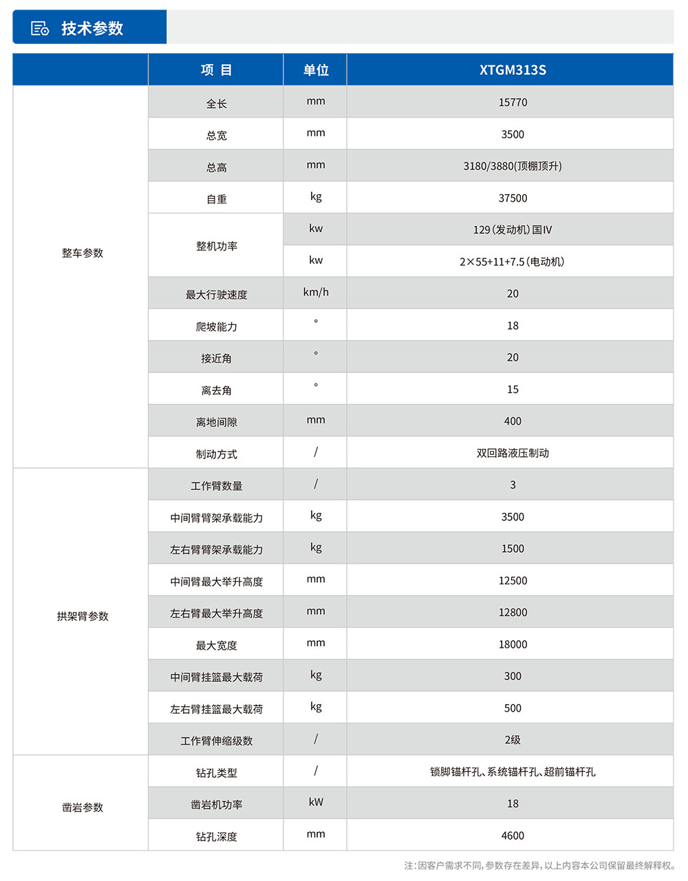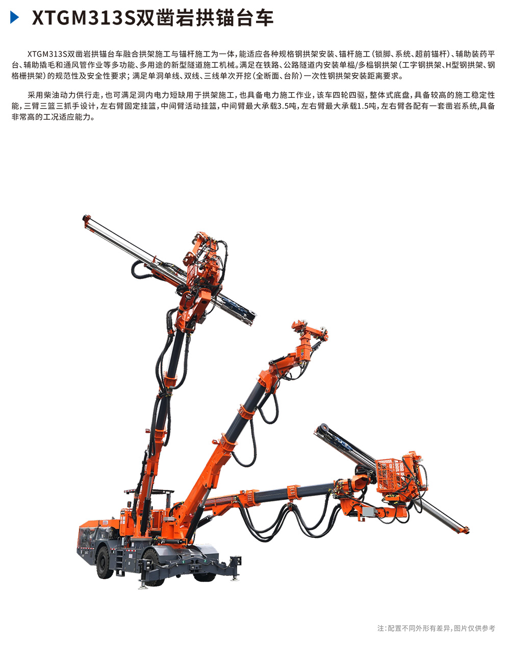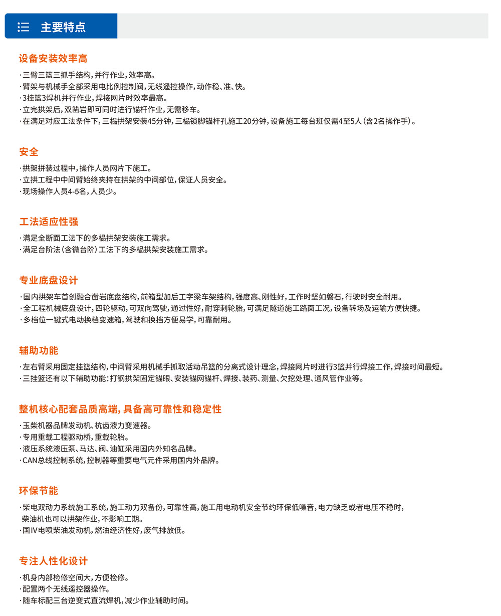XTGM313S雙鑿巖拱錨臺(tái)?融合拱架施?與錨桿施?為?體,能適應(yīng)各種規(guī)格鋼拱架安裝、錨桿施?(鎖腳、系統(tǒng)、超前錨桿)、輔助裝藥平臺(tái)、輔助撬?和通?管作業(yè)等多功能、多?途的新型隧道施?機(jī)械。滿?在鐵路、公路隧道內(nèi)安裝單榀/多榀鋼拱架(?字鋼拱架、H型鋼拱架、鋼格柵拱架)的規(guī)范性及安全性要求;滿?單洞單線、雙線、三線單次開挖(全斷?、臺(tái)階)?次性鋼拱架安裝距離要求。·三臂三籃三抓?結(jié)構(gòu),并?作業(yè),效率?。·臂架與機(jī)械?全部采?電?例控制閥,?線遙控操作,動(dòng)作穩(wěn)、準(zhǔn)、快?!?掛籃3焊機(jī)并?作業(yè),焊接??時(shí)效率最?。·?完拱架后,雙鑿巖即可同時(shí)進(jìn)?錨桿作業(yè),?需移??!ぴ跐M?對應(yīng)?法條件下,三榀拱架安裝45分鐘,三榀鎖腳錨桿孔施?20分鐘,設(shè)備施?每臺(tái)班僅需4?5?(含2名操作?)。