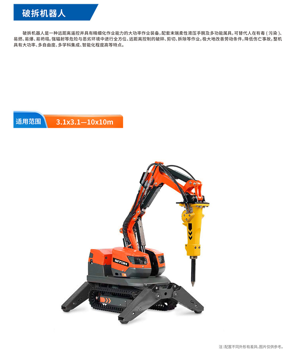 破拆機器?是?種遠距離遙控并具有精細化作業(yè)能?的?功率作業(yè)裝備,配套末端柔性液壓?腕及多功能屬具,可替代?在有毒(污染)、易燃、易爆、易坍塌,強輻射等危險與惡劣環(huán)境中進?全?位、遠距離控制的破碎、剪切、拆除等作業(yè),極?地改善勞動條件,降低傷亡事故,整機具有?功率、多?由度、多學科集成、智能化程度?等特點。